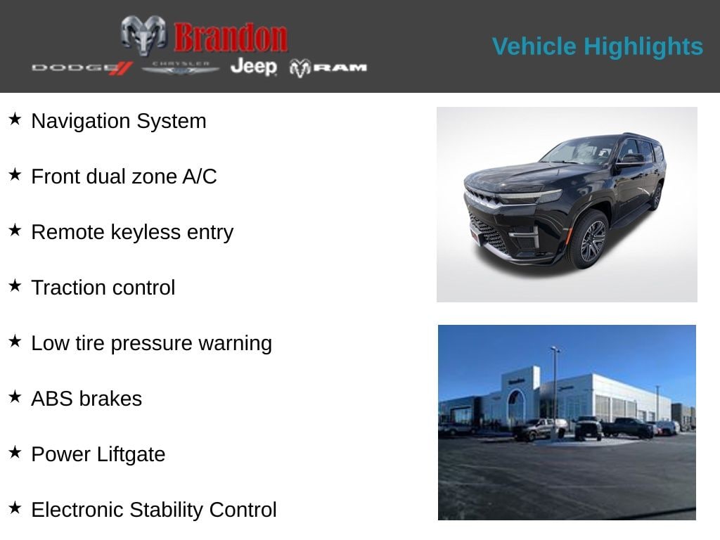 Don't miss the opportunity to make the 2026 Jeep Grand Wagoneer Base your own. Visit our showroom today and let us demonstrate why this exceptional SUV is the perfect choice for your next adventure. Price includes: $1000 - 2026 National Stellantis Loyalty Bonus Cash . Exp. 04/30/2026