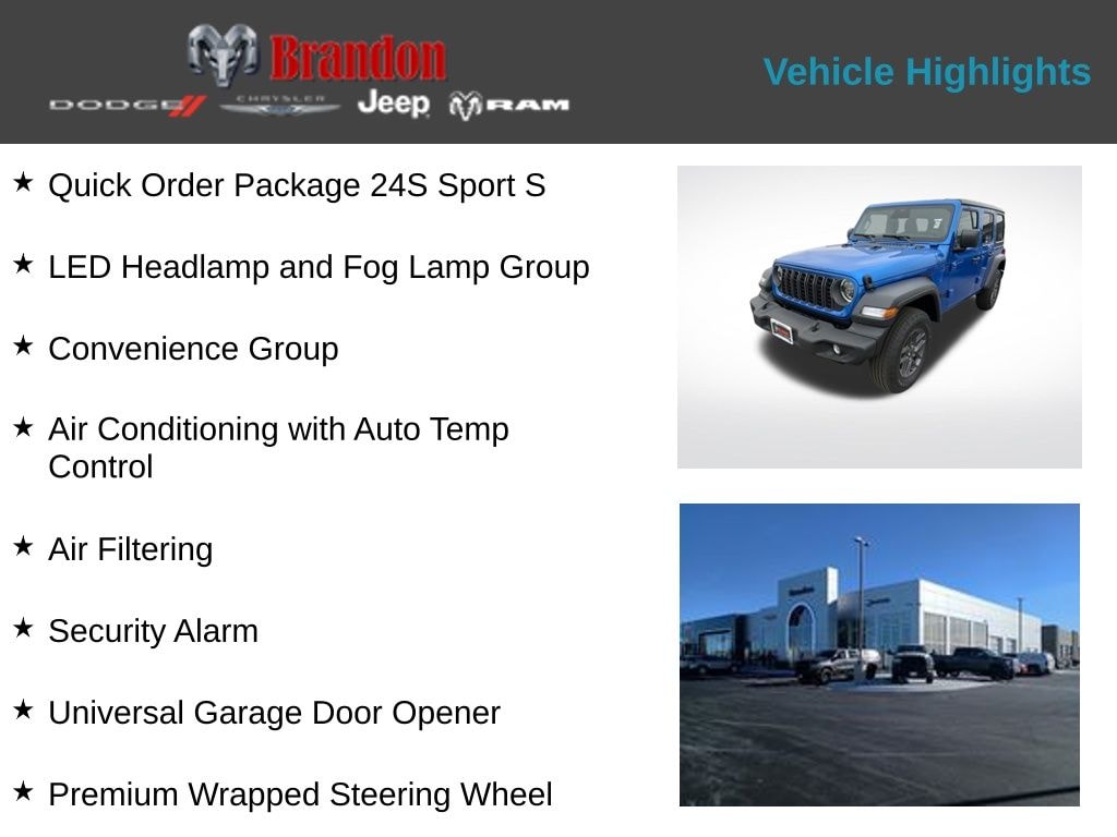 Whether you're seeking the ultimate off-road adventure or a versatile daily driver, the 2026 Jeep Wrangler Sport S is the perfect choice. Experience the freedom and capability that only a Jeep can deliver. Visit our showroom today and let us help you discover the perfect Wrangler for your lifestyle. Price includes: $1000 - 2026 National Retail Bonus Cash . Exp. 04/30/2026 $1000 - 2026 National Stellantis Loyalty Bonus Cash . Exp. 04/30/2026