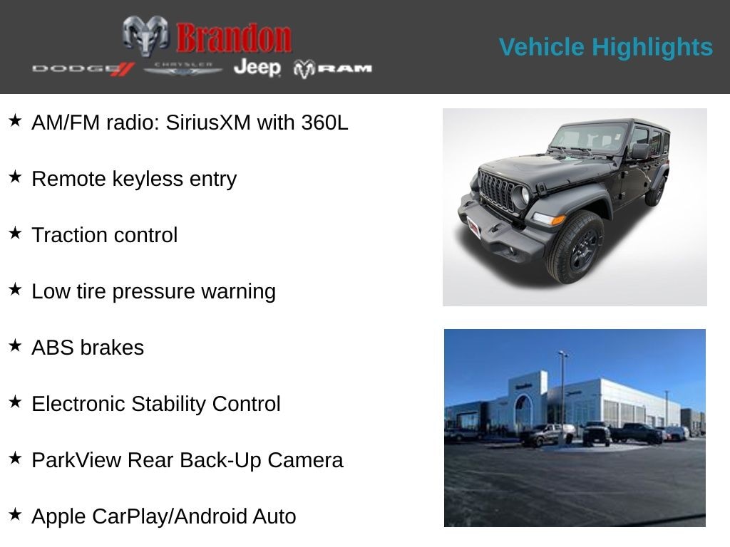 Don't miss your chance to own this exceptional Jeep Wrangler Sport. Contact us today to learn more and take the first step towards your next great adventure. Price includes: $1000 - 2026 National Retail Bonus Cash . Exp. 03/31/2026 $1000 - 2026 National Stellantis Loyalty Bonus Cash . Exp. 03/31/2026 $1500 - 2026 National Select Inventory Bonus Cash . Exp. 01/04/2027