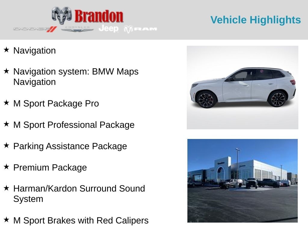 Alpine White 2025 BMW X3 M50 xDrive AWD 8-Speed Automatic I6 X3 M50 xDrive, 8-Speed Automatic, AWD, Alpine White, ACC Stop and Go + Active Driving Assistant, BMW Curved Display with HUD, Extended Shadowline Trim, Full LED Lights with Cornering Lights, Harman/Kardon Surround Sound System, Interior Camera, M Shadowline Lights, M Sport Brakes with Red Calipers, M Sport Package Pro, M Sport Professional Package, Navigation, Navigation system: BMW Maps Navigation, Parking Assistance Package, Parking Assistant Plus, Parking Assistant Professional, Premium Content 1, Premium Package.