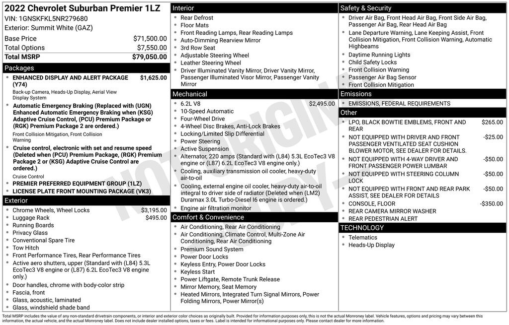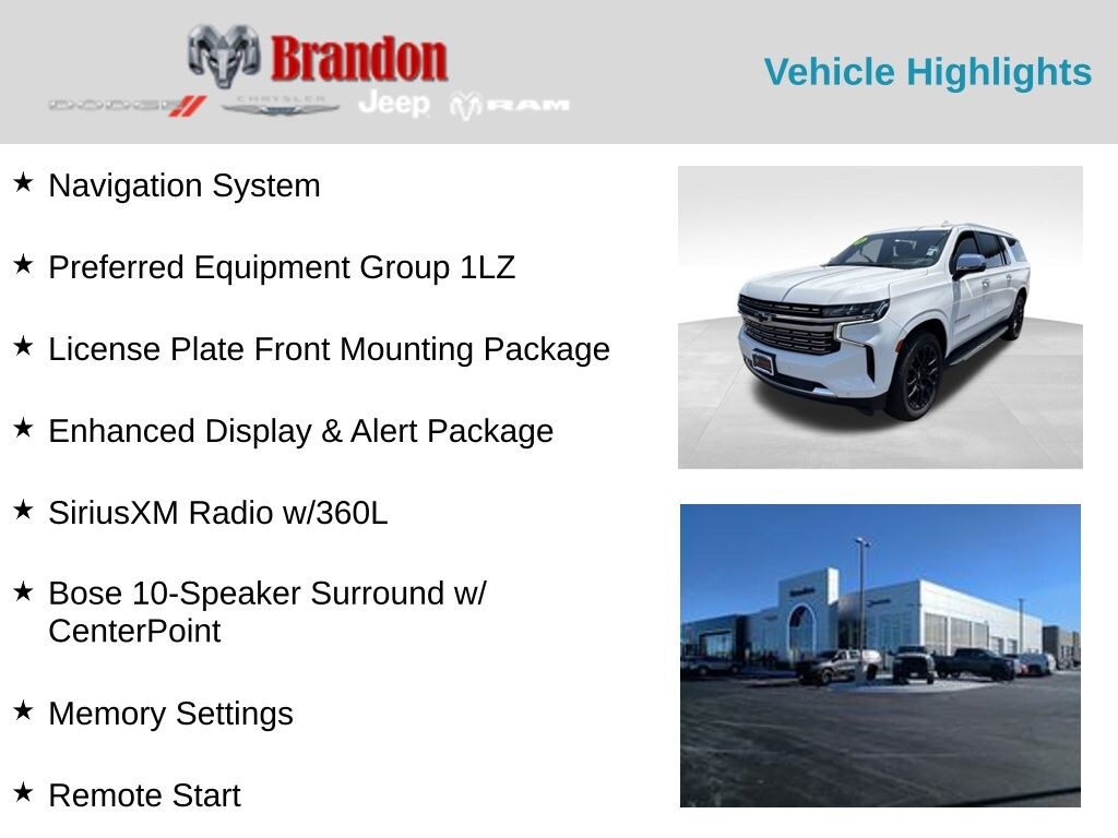 Summit White 2022 Chevrolet Suburban Premier 4WD 10-Speed Automatic with Overdrive EcoTec3 6.2L V8 EcoTec3 6.2L V8, 4WD, 15" Diagonal Multi-Color Head-Up Display, 1st & 2nd Row Color-Keyed Carpeted Floor Mats, 2-Speed Active Electronic AutoTrac Transfer Case, 3rd Row 60/40 Power-Folding Split-Bench, Auto-Dimming Inside Rear-View Mirror, Automatic Stop/Start, Bose 10-Speaker Surround w/CenterPoint, Bright Front & Rear Door Sill Plates, Chrome Door Handles w/Body-Color Strip, Chrome Mirror Caps, Color-Keyed Carpeting Floor Covering, Driver & Front Outboard Passenger Airbags, Dual Exhaust System, Enhanced Display & Alert Package, Enhanced Driver Information Center, Floor Console, Front & Rear Park Assist, Hands-Free Rear Power Programmable Liftgate, HD Surround Vision, Heated & Ventilated Driver & Front Passenger Seats, Heated 2nd Row Outboard Seats, Heated Driver & Front Passenger Seats, Heated Steering Wheel, Hill Descent Control, Infotainment Display, Inside Rearview Auto-Dimming Rear Camera Mirror, Lane Change Alert w/Side Blind Zone Alert, Leather-Wrapped Steering Wheel, LED Daytime Running Lamps, License Plate Front Mounting Package, Memory Settings, Navigation System, Outside Heated Power-Adjustable Mirrors, Power Release 2nd Row Bucket Seats, Power Tilt & Telescopic Steering Column, Preferred Equipment Group 1LZ, Rear Camera Mirror Washer, Rear Cross Traffic Alert, Rear Pedestrian Alert, Remote Start, Safety Alert Seat, SiriusXM Radio w/360L, Start/Stop System Disable Button, Universal Home Remote, Wireless Charging.