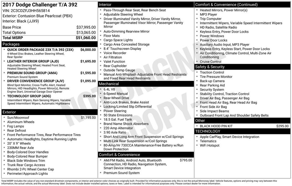 Contusion Blue Pearlcoat 2017 Dodge Challenger R/T RWD Tremec 6-Speed Manual SRT HEMI 6.4L V8 Challenger R/T, SRT HEMI 6.4L V8, Tremec 6-Speed Manual, 18 Speakers Premium Audio System, 20" x 9.0" Aluminum Wheels, 392 Fender Decal, ABS brakes, Alloy wheels, Anti-Lock 4-Wheel Disc 6 Piston Brakes, Auto High Beam Headlamp Control, Black Fuel Filler Door, Black Grille w/Bezel, Black Satin Hood, Blind Spot & Cross Path Detection, Challenger Script Grille Badge, Compass, Driver Convenience Group, Electronic Stability Control, Front dual zone A/C, Gloss Black I/P Cluster Trim Rings, GPS Antenna Input, harman/kardon GreenEdge Amp, Heated door mirrors, Houndstooth Low-Back Bucket Seats, Illuminated Air-Catcher Headlamp, Illuminated entry, Leather Performance Steering Wheel, Low tire pressure warning, MOPAR Cold Air Intake System, Navigation System, ParkView Rear Back-Up Camera, Power Multi-Function Foldaway Mirrors, Premium Sound Group, Quick Order Package 23X T/A 392, Rain Sensitive Windshield Wipers, Rear Black Spoiler, Remote keyless entry, Remote Start System, Rhombi 2-Pc Wheel Center Cap, Satin Wrap Roof/Decklid, T/A Air Grabber Hood w/Air Bezel, T/A Bodyside Graphic, T/A Package, T/A Spoiler Decal, Technology Group, Traction control, Universal Garage Door Opener, Wheels: 20" x 9.5" Forged/Painted Aluminum, White Face Instrument Cluster.
