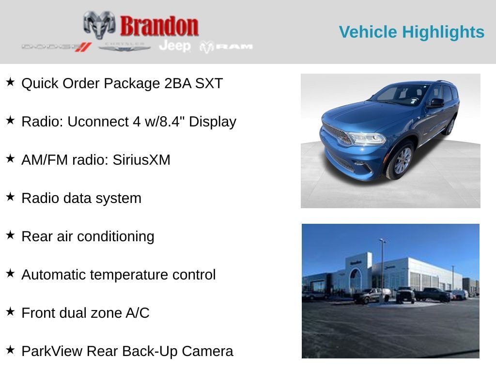 Frostbite Pearlcoat 2023 Dodge Durango SXT AWD 8-Speed Automatic 3.6L V6 24V VVT Durango SXT, AWD, Frostbite Pearlcoat, Black Cloth, AM/FM radio: SiriusXM, Apple CarPlay/Android Auto, Automatic temperature control, Front dual zone A/C, Fully automatic headlights, Heated Front Seats, Heated Steering Wheel, ParkView Rear Back-Up Camera, Quick Order Package 2BA SXT, Radio data system, Radio: Uconnect 4 w/8.4" Display, Rear air conditioning, Speed control.