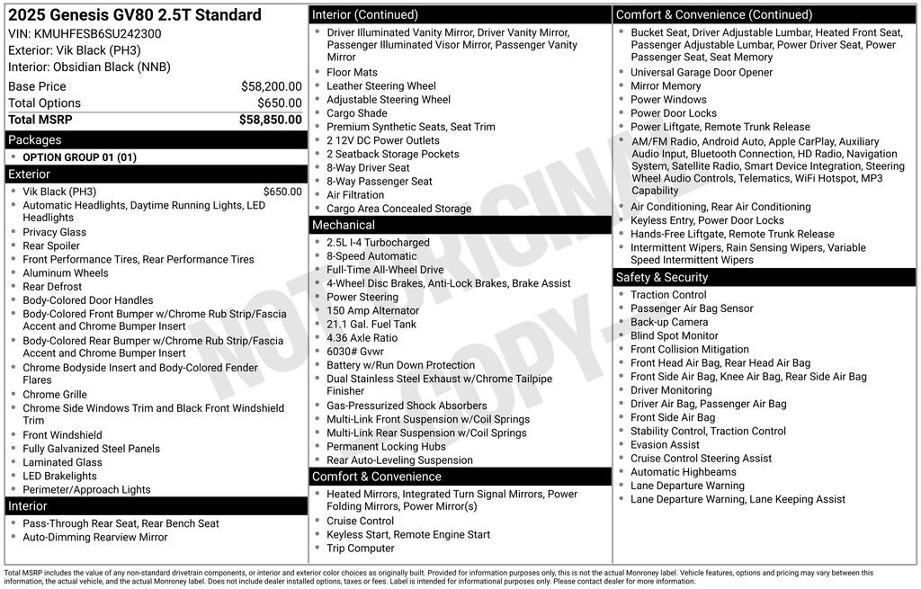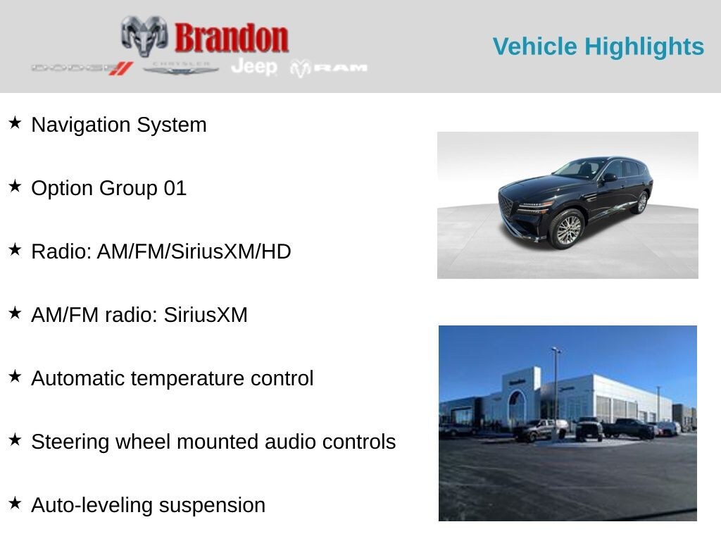 Vik Black 2025 Genesis GV80 2.5T AWD 8-Speed Automatic 2.5L DOHC AWD, AM/FM radio: SiriusXM, Auto-leveling suspension, Automatic temperature control, Navigation System, Option Group 01, Radio: AM/FM/SiriusXM/HD, Steering wheel mounted audio controls.