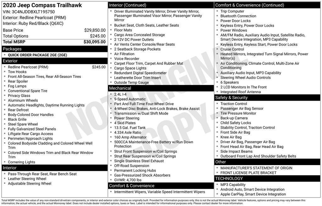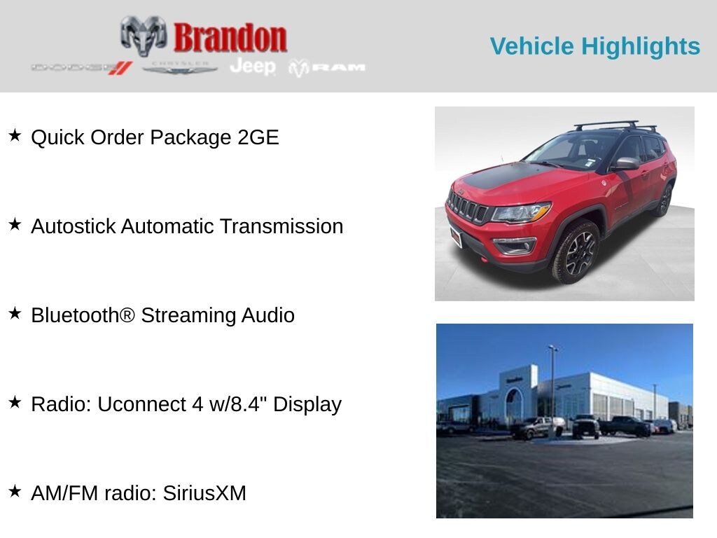 Redline Pearlcoat 2020 Jeep Compass Trailhawk 4WD 9-Speed 948TE Automatic 2.4L I4 Compass Trailhawk, 2.4L I4, 4WD, AM/FM radio: SiriusXM, Autostick Automatic Transmission, Bluetooth® Streaming Audio, Quick Order Package 2GE, Radio: Uconnect 4 w/8.4" Display.