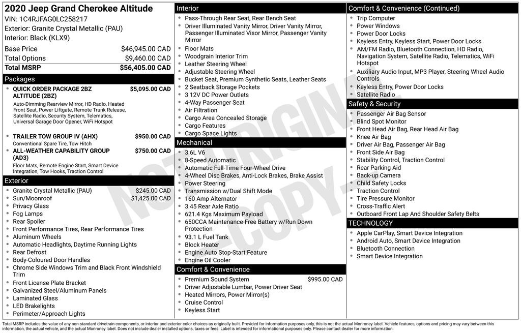 Granite Crystal Metallic Clearcoat 2020 Jeep Grand Cherokee Altitude 4WD 8-Speed Automatic 3.6L V6 24V VVT 3.6L V6 24V VVT, 4WD, 1-Year SiriusXM Guardian Trial, 115V Auxiliary Power Outlet, 180 Amp Alternator, 4G LTE Wi-Fi Hot Spot, 5-Year SiriusXM Traffic Service, 5-Year SiriusXM Travel Link Service, 7 & 4 Pin Wiring Harness, 8.4" Touchscreen Display, Apple CarPlay, Auto-Dimming Rear-View Mirror, Body Color Shark Fin Antenna, Class IV Receiver Hitch, Dark Lens Taillamps, Disassociated Touchscreen Display, For Details Visit DriveUconnect.com, Gloss Black Rear Fascia Applique, Google Android Auto, GPS Antenna Input, GPS Navigation, HD Radio, Heavy-Duty Engine Cooling, Instrument Cluster w/Off-Road Disp. Pages, Integrated Center Stack Radio, Integrated Voice Command w/Bluetooth, Jeep Black Gloss Badging, Power 4-Way Driver Lumbar Adjust, Power 8-Way Driver/Manual Passenger Seat, Quick Order Package 2BZ Altitude, Radio: Uconnect 4C Nav w/8.4" Display, Rear Fascia Black MIC Step Pad, Rear Load Leveling Suspension, Security & Convenience Group, Security Alarm, SiriusXM Satellite Radio, SiriusXM Traffic Plus, SiriusXM Travel Link, Steering Wheel Mounted Audio Controls, Trailer Tow Group IV, Universal Garage Door Opener, USB Host Flip, Wheels: 20" x 8.0" Gloss Black Aluminum.