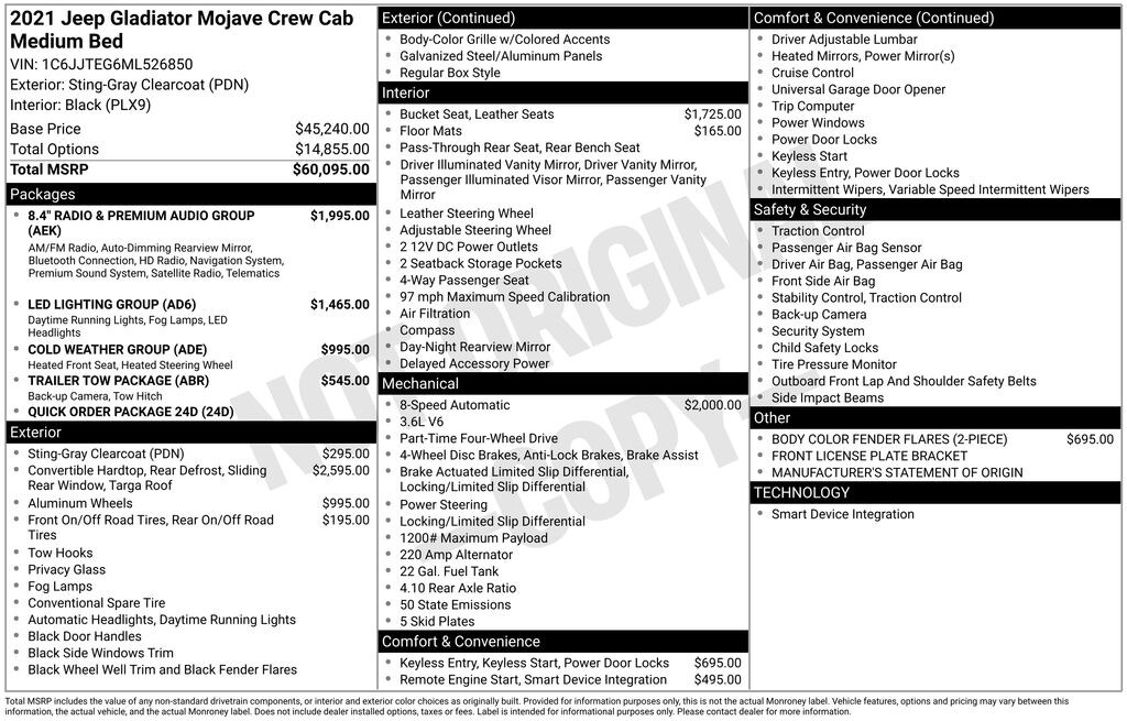 Sting-Gray Clearcoat 2021 Jeep Gladiator Mojave 4WD 8-Speed Automatic 3.6L V6 24V VVT Gladiator Mojave, 3.6L V6 24V VVT, 4WD, 1-Year SiriusXM Guardian Trial, 240 Amp Alternator, 5-Year SiriusXM Traffic Service, 5-Year SiriusXM Travel Link Service, 8.4" Radio & Premium Audio Group, 8.4" Touchscreen Display, Alpine Premium Audio System, Auto-Dimming Rear-View Mirror, Class IV Hitch Receiver, Cold Weather Group, Daytime Running Lamps LED Accents, Emergency/Assistance Call, For Details, Visit DriveUconnect.com, Front LED Fog Lamps, GPS Navigation, HD Radio, Heated Front Seats, Heated Steering Wheel, Heavy-Duty Engine Cooling, LED Lighting Group, LED Park Turn Lamps, LED Premium Reflector Headlamps, LED Taillamps, Quick Order Package 24D, Radio: Uconnect 4C Nav w/8.4" Display, SiriusXM Traffic Plus, SiriusXM Travel Link, Trailer Hitch Zoom, Trailer Tow Package.
