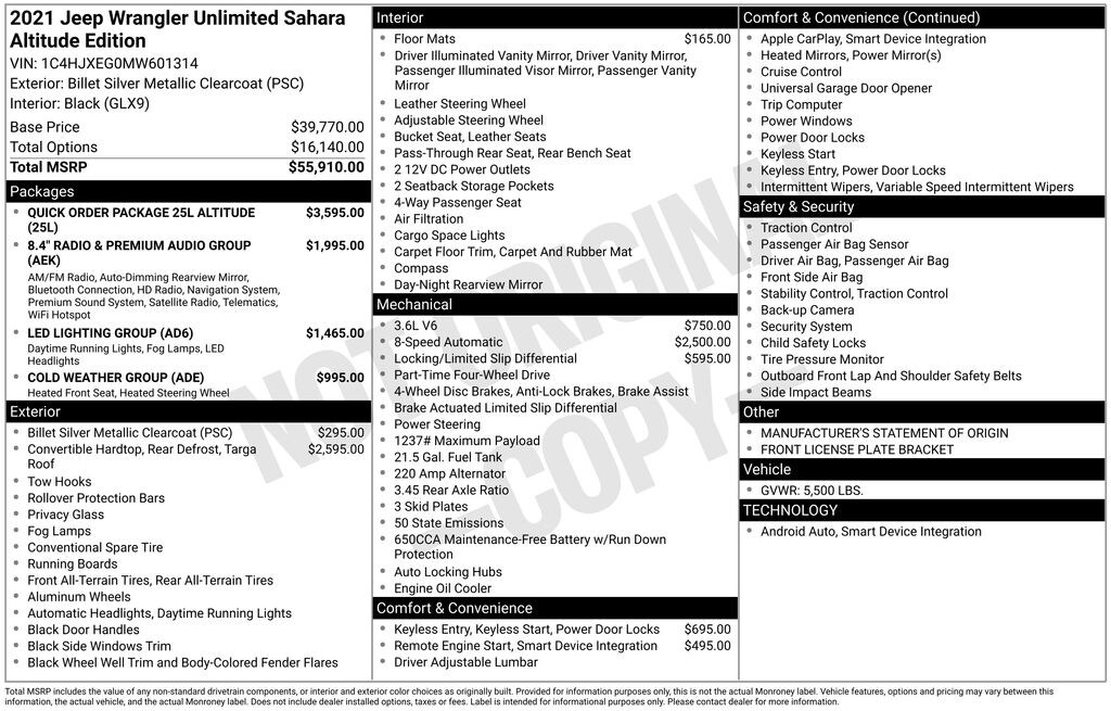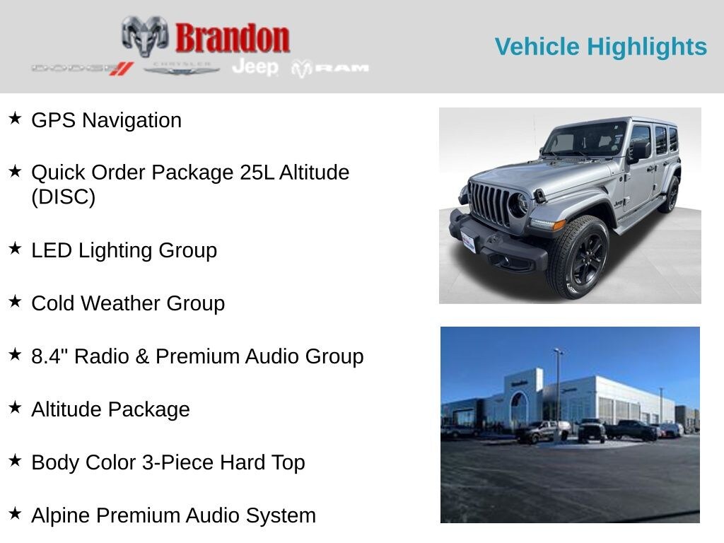 Billet Silver Metallic Clearcoat 2021 Jeep Wrangler Unlimited Sahara Altitude 4WD 8-Speed Automatic 3.6L V6 24V VVT 3.6L V6 24V VVT, 4WD, 1-Year SiriusXM Guardian Trial, 4G LTE Wi-Fi Hot Spot, 5-Year SiriusXM Traffic Service, 5-Year SiriusXM Travel Link Service, 8.4" Radio & Premium Audio Group, 8.4" Touchscreen Display, Alpine Premium Audio System, Altitude Package, Auto-Dimming Rear-View Mirror, Black Interior Accents, Black Trail Rated Badge, Body Color 3-Piece Hard Top, Body Color Grille w/Gloss Black Rings, Cold Weather Group, Daytime Running Lamps LED Accents, Emergency/Assistance Call, For Details, Visit DriveUconnect.com, Front LED Fog Lamps, GPS Navigation, HD Radio, Heated Front Seats, Heated Steering Wheel, Leather Trimmed Bucket Seats, Leather Wrapped Park Brake Handle, Leather Wrapped Shift Knob, LED Lighting Group, LED Premium Reflector Headlamps, LED Taillamps, Matte Black Jeep Badge, Mold In Color Bumper w/Gloss Black, MOPAR Hardtop Headliner, Quick Order Package 25L Altitude (DISC), Radio: Uconnect 4C Nav w/8.4" Display, SiriusXM Traffic Plus, SiriusXM Travel Link, Wheels: 18" x 7.5" Gloss Black Aluminum, Wizard Black Instrument Panel Bezels.