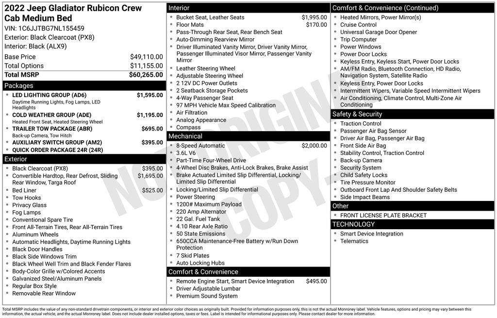 Black Clearcoat 2022 Jeep Gladiator Rubicon 4WD 8-Speed Automatic 3.6L V6 24V VVT 240 Amp Alternator, 700 Amp Maintenance Free Battery, Auxiliary Switch Group, Auxiliary Switches, Class IV Receiver Hitch, Cold Weather Group, Daytime Running Lamps LED Accents, Front LED Fog Lamps, Heated Front Seats, Heated Steering Wheel, Heavy-Duty Engine Cooling, LED Lighting Group, LED Park Turn Lamps, LED Premium Reflector Headlamps, LED Taillamps, Navigation System, Quick Order Package 24R, Radio: Uconnect 4C Nav w/8.4" Display, Trailer Hitch Zoom, Trailer Tow Package.