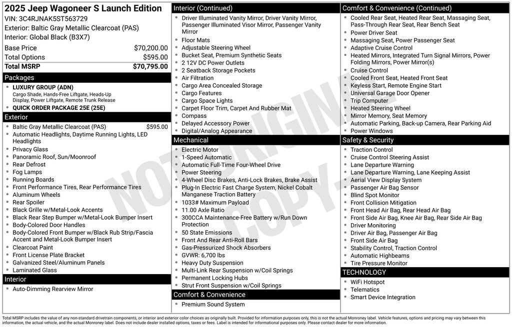 Baltic Gray Metallic Clearcoat 2025 Jeep Wagoneer S Launch Edition 4WD 1-Speed Automatic Electric Motor 115V Auxiliary Power Outlet, Digital Rearview Mirror, Front Passenger Interactive Display, Hands Free Power Liftgate, Heads-Up Display, Luxury Group, Navigation System, Power moonroof, Premium audio system: UConnect 5, Quick Order Package 25E, Radio: Uconnect 5 Nav w/12.3" Display, Roll-Up Tonneau Cover, Two Tone Paint Group.