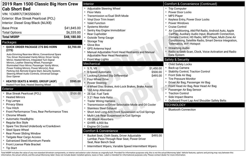 Blue Streak Pearlcoat 2019 Ram 1500 Classic SLT 4WD 8-Speed Automatic HEMI 5.7L V8 Multi Displacement VVT 4D Crew Cab, HEMI 5.7L V8 Multi Displacement VVT, 4WD, 1-Yr SiriusXM Guardian Trial, 115V Auxiliary Power Outlet, 40/20/40 Split Bench Seat, 8.4" Touchscreen Display, Air Conditioning ATC w/Dual Zone Control, Apple CarPlay, Auto-Dimming Exterior Mirrors, Auto-Dimming Rear-View Mirror, Big Horn Badge, Big Horn Regional Package, Bright/Bright Billets Grille, Class IV Receiver Hitch, Cloth 40/20/40 Premium Bench Seat, Cluster 7.0" TFT Color Display, Dual Rear Exhaust w/Bright Tips, Electric Shift-On-Demand Transfer Case, Exterior Mirrors Courtesy Lamps, Exterior Mirrors w/Supplemental Signals, Folding Flat Load Floor Storage, Front Armrest w/3 Cupholders, Front Center Seat Cushion Storage, Front Fog Lamps, Glove Box Lamp, Google Android Auto, GPS Antenna Input, HD Radio, Heated Front Seats, Heated Seats & Wheel Group, Heated Steering Wheel, Humidity Sensor, Integrated Voice Command w/Bluetooth, Leather Wrapped Steering Wheel, LED Bed Lighting, Media Hub (2 USB, AUX), Overhead Console w/Garage Door Opener, ParkSense Ft/Rr Park Assist System, Power 10-Way Driver Seat, Power Heated Fold-Away Mirrors, Power Lumbar Adjust, Power-Folding Mirrors, Quick Order Package 27S Big Horn, Radio: Uconnect 4C w/8.4" Display, Rear 60/40 Split Folding Seat, Rear Dome w/On/Off Switch Lamp, Rear Floor Mats, Rear Power Sliding Window, Remote Start System, Remote USB Port - Charge Only, Security Alarm, SiriusXM Satellite Radio, Steering Wheel Mounted Audio Controls, Storage Tray, Sun Visors w/Illuminated Vanity Mirrors, Universal Garage Door Opener, USB Host Flip, Wheels: 20" x 8" Aluminum Chrome Clad.