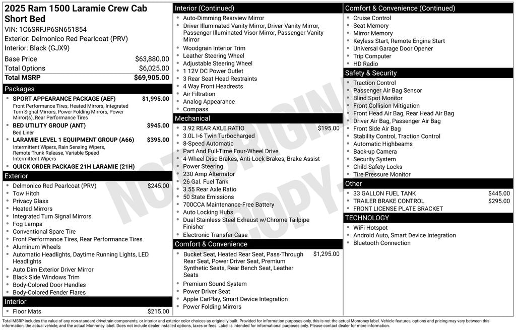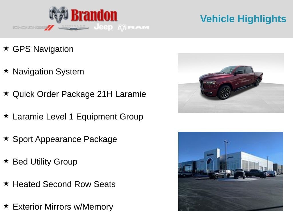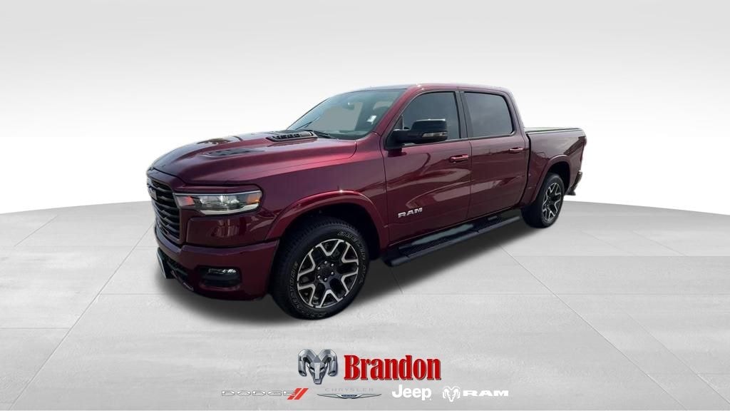 Delmonico Red Pearlcoat 2025 Ram 1500 Laramie 4WD 8-Speed Automatic 3.0L I6 #1 Seat Foam Cushion, 3 Rear Seat Head Restraints, 4 Way Front Headrests, Accent Color Premium Power Mirrors, Auto Power-Folding Mirrors, Auto-Dimming Exterior Driver Mirror, Bed Utility Group, Black Interior Accents, Black Painted Exterior Mirrors Caps, Body Color Front Bumper, Body Color Rear Bumper w/Step Pads, Bridgestone Brand Tires, Bucket Seats, Center Console Parts Module, Convex Wide-Angle Exterior Mirror Insert, Driver Seat Memory, Exterior Mirrors Courtesy Lamps, Exterior Mirrors w/Heating Element, Exterior Mirrors w/Memory, Exterior Mirrors w/Supplemental Signals, Front Seat Back Map Pockets, Full Length Upgraded Floor Console, GPS Navigation, Grille Surround 3 Body Color Tex 2 Black, Heated Front Seats, Heated Second Row Seats, Heated Steering Wheel, Laramie Level 1 Equipment Group, Leather Trimmed Bucket Seats, MOPAR 4 Adjustable Cargo Tie-Down Hooks, MOPAR Spray In Bedliner, Navigation System, Power 2-Way Driver Lumbar Adjust, Power 2-Way Passenger Lumbar Adjust, Power Adjust 8-Way Driver Seat, Power Adjust 8-Way Front Passenger Seat, Quick Order Package 21H Laramie, Rain Sensitive Windshield Wipers, RAM Grille Badge - Chrome, Rear 60/40 Folding Split Recline Seat, Remote Tailgate Release, Sport Appearance Package, Sport Performance Hood, Ventilated Front Seats.