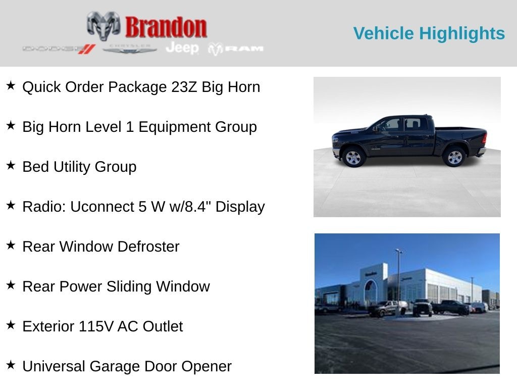 Forged Blue Metallic 2025 Ram 1500 Big Horn/Lone Star 4WD 8-Speed Automatic 3.6L V6 24V VVT 1500 Big Horn/Lone Star, 3.6L V6 24V VVT, 4WD, 115V Auxiliary Power Outlet, 2nd Row In Floor Storage Bins, 400W Inverter, Auto Power-Folding Mirrors, Auto-Dimming Exterior Driver Mirror, Auto-Dimming Rear-View Mirror, Bed Utility Group, Big Horn Badge, Big Horn Level 1 Equipment Group, Black Exterior Mirrors, Black Premium Power Mirrors, Convex Wide-Angle Exterior Mirror Insert, Exterior 115V AC Outlet, Exterior Mirrors Courtesy Lamps, Exterior Mirrors w/Heating Element, Exterior Mirrors w/Supplemental Signals, Glove Box Lamp, Heated Front Seats, Heated Steering Wheel, Leather Wrapped Steering Wheel, MOPAR 4 Adjustable Cargo Tie-Down Hooks, MOPAR Spray In Bedliner, Pick-Up Box Lighting, Power 2-Way Driver Lumbar Adjust, Power Adjust 8-Way Driver Seat, Power Adjustable Pedals, Quick Order Package 23Z Big Horn, Radio: Uconnect 5 W w/8.4" Display, Rear Power Sliding Window, Rear Window Defroster, Steering Wheel Mounted Audio Controls, Sun Visors w/Illuminated Vanity Mirrors, Universal Garage Door Opener.