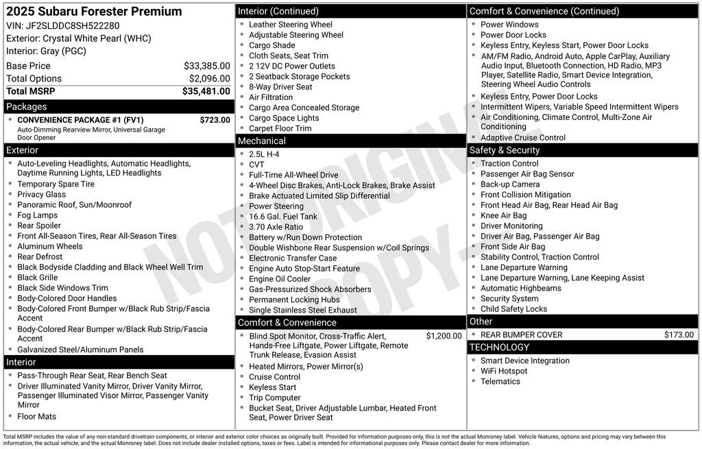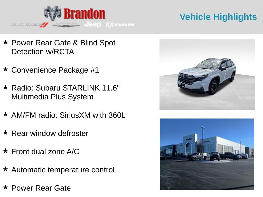 Crystal White Pearl 2025 Subaru Forester Premium AWD Lineartronic CVT 2.5L 4-Cylinder DOHC 16V All-Weather Floor Liners, AM/FM radio: SiriusXM with 360L, Auto-Dimming Mirror w/Compass & HomeLink, Automatic Emergency Steering, Automatic temperature control, Blind-Spot Detection (BSD)/RCTA System, Cargo Tray, Convenience Package #1, Front dual zone A/C, Power driver seat, Power Rear Gate, Power Rear Gate & Blind Spot Detection w/RCTA, Radio: Subaru STARLINK 11.6" Multimedia Plus System, Rear window defroster, Remote keyless entry, Steering wheel mounted audio controls.