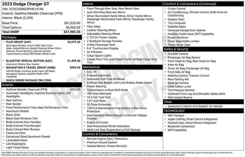 Certified. Sublime Metallic Clearcoat 2023 Dodge Charger GT AWD 8-Speed Automatic 3.6L V6 24V VVT AWD, Black Artificial Leather, 1-Yr SiriusXM Guardian Trial, 2-Piece Shark Fin Antenna, 4G LTE Wi-Fi Hot Spot, 5-Year SiriusXM Traffic Service, 5-Year SiriusXM Travel Link Service, 8.4" Touchscreen Display, Apple CarPlay, Auto Adjust In Reverse Exterior Mirrors, Auto-Dimming Exterior Driver Mirror, Black-Edged Premium Floormats, Blind Spot & Cross Path Detection, Blind Spot Memory/Power/Heat Mirror, Compass Gauge, Deluxe Security Alarm, Driver & Passenger Lower LED Lamps, Exterior Mirrors Courtesy Lamps, Exterior Mirrors w/Heating Element, For Details, Visit DriveUconnect.com, Front & Rear LED Map Pockets, Front Overhead LED Lighting, Google Android Auto, GPS Antenna Input, GPS Navigation, HD Radio, Heated Front Seats, Heated Steering Wheel, Integrated Center Stack Radio, Integrated Voice Command w/Bluetooth, Media Hub (2 USB, AUX), Nappa/Alcantara Performance Seat, Navigation & Travel Group (DISC), Performance Steering Wheel, Plus Group, Power 2-Way Driver Lumbar Adjust, Power 2-Way Passenger Lumbar Adjust, Power Front Driver/Passenger Seats, Power Tilt/Telescope Steering Column, Premium-Stitched Dash Panel, Projector LED Fog Lamps, Quick Order Package 29H, Radio/Driver Seat/Mirrors Memory, Radio: Uconnect 4C Nav w/8.4" Display (DISC), Rear Armrest w/Cupholder Seat, SiriusXM Traffic Plus, SiriusXM Travel Link, Steering Wheel Mounted Shift Control, USB Host Flip, Ventilated Front Seats.