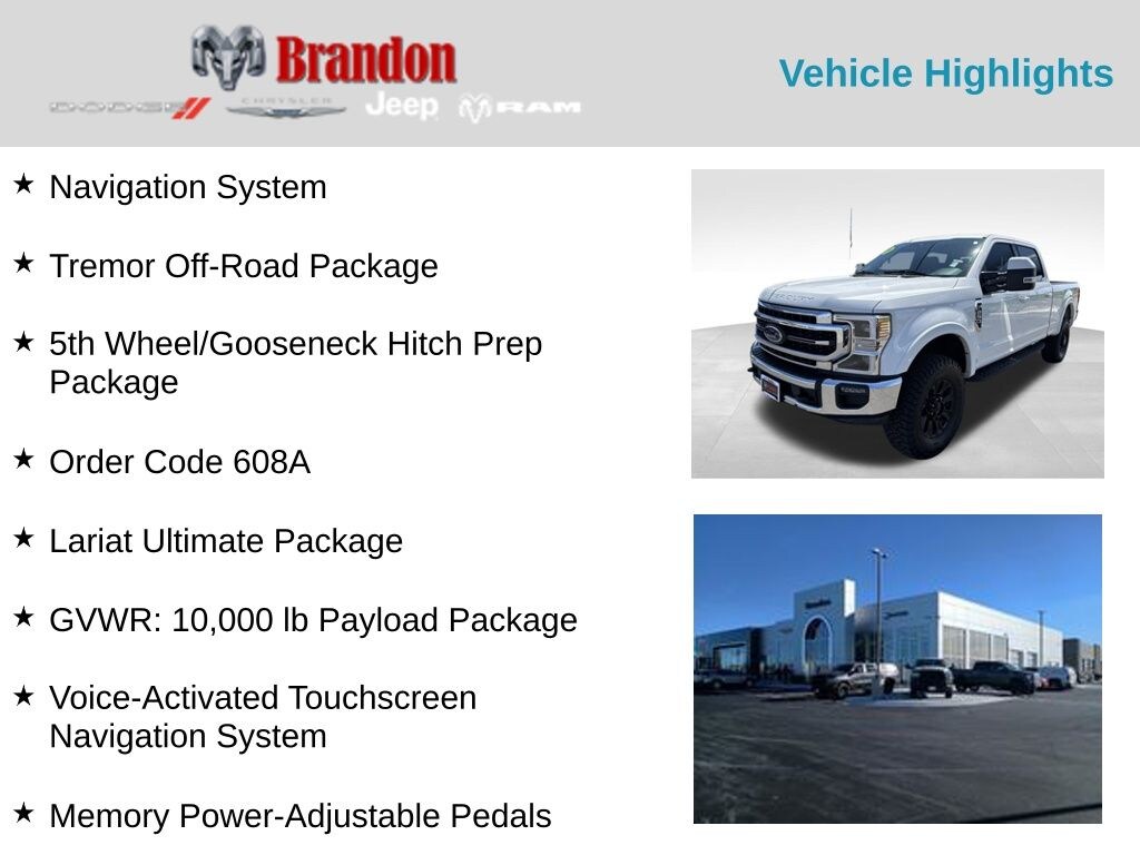 Certified. Oxford White 2020 Ford F-250SD Lariat 4WD 10-Speed Automatic 7.3L V8 PFI SOHC 16V Federal 385hp 4WD, 5th Wheel/Gooseneck Hitch Prep Package, Ambient Lighting - Fixed Color, Body-Color Wheellip Moldings, Easy Entry®/Exit Memory Driver's Seat Feature, GVWR: 10,000 lb Payload Package, Intelligent Access w/Push-Button Start, Lariat Ultimate Package, LED Box Lighting, Memory Power-Adjustable Pedals, Navigation System, Order Code 608A, Power Heated/Ventilated Driver Seat w/Memory, Power Heated/Ventilated Passenger Seat, Power Telescoping/Tilt Steering Wheel/Column, PowerScope Trailer Tow Mirrors w/Memory, Remote Start System, Remote Tailgate Release, Tailgate Step & Handle, Textured Matte Finish Off-Road Running Boards, Tremor Off-Road Decal, Tremor Off-Road Package, Voice-Activated Touchscreen Navigation System, Wheels: 18" Low-Gloss Black Painted Aluminum.