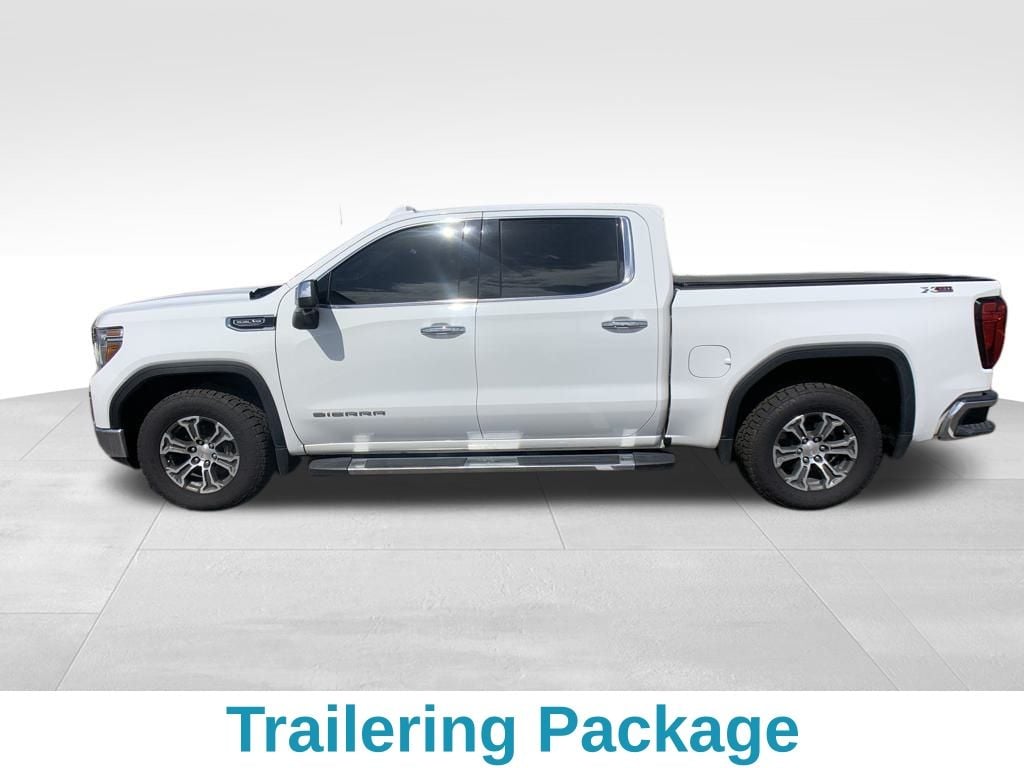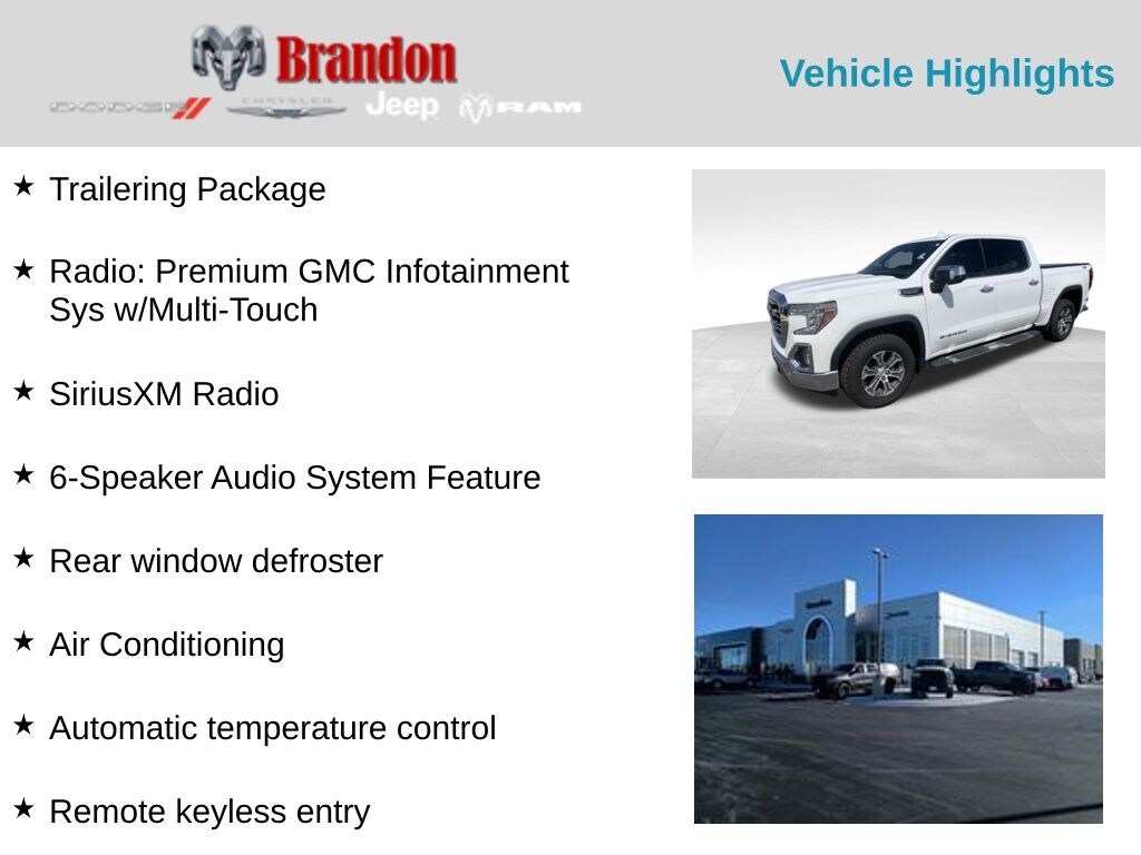 Certified. White 2019 GMC Sierra 1500 SLT 4WD 8-Speed Automatic EcoTec3 5.3L V8 8-Speed Automatic, 4WD, Dark Walnut/Dark Ash Gray w/Forge Perforated Leather-Appointed Seat Trim, 6-Speaker Audio System Feature, Air Conditioning, Automatic temperature control, Memory seat, Power driver seat, Radio: Premium GMC Infotainment Sys w/Multi-Touch, Rear window defroster, Remote keyless entry, SiriusXM Radio, Trailering Package.