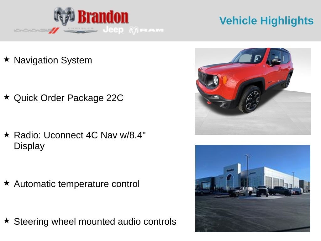 Certified. Colorado Red Clearcoat 2023 Jeep Renegade Trailhawk 4WD 9-Speed 948TE Automatic 1.3L I4 Renegade Trailhawk, 1.3L I4, 4WD, Colorado Red Clearcoat, Automatic temperature control, Navigation System, Quick Order Package 22C, Radio: Uconnect 4C Nav w/8.4" Display, Steering wheel mounted audio controls.
