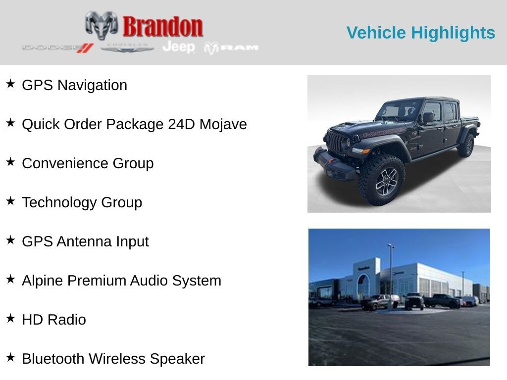 Certified. Black Clearcoat 2024 Jeep Gladiator Mojave 4WD 8-Speed Automatic 3.6L V6 24V VVT 4WD, 12.3" Touchscreen Display, 4G LTE Wi-Fi Hot Spot, Alexa Built-In, Alpine Premium Audio System, Apple CarPlay, Auto-Dimming Rear-View Mirror, Bluetooth Wireless Speaker, Connected Travel & Traffic Services, Connectivity - US/Canada, Convenience Group, Emergency/Assistance Call, For Details, Visit DriveUconnect.com, Google Android Auto, GPS Antenna Input, GPS Navigation, HD Radio, Heated Front Seats, Heated Steering Wheel, Integrated Off-Road Camera, Integrated Voice Command w/Bluetooth, Quick Order Package 24D Mojave, Radio: Uconnect 5 Nav w/12.3" Display, Remote Start System, SiriusXM Radio Service, SiriusXM w/360L, Technology Group, Universal Garage Door Opener, USB Host Flip.
