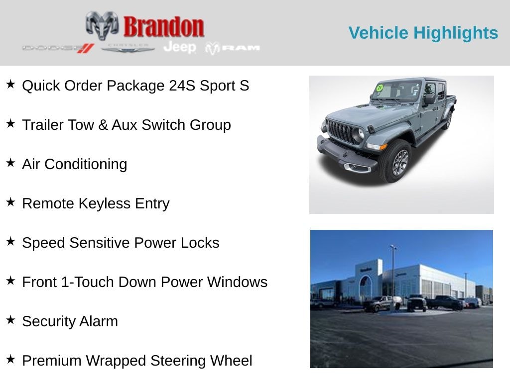 Certified. Anvil Clear Coat 2024 Jeep Gladiator Sport 4WD 8-Speed Automatic 3.6L V6 24V VVT 4WD, 240 Amp Alternator, Advanced Brake Assist, Air Conditioning, Automatic Headlamps, Auxiliary Switches, Body Color Fender Flares (2-Piece), Class IV Receiver Hitch, Daytime Running Lamp System, Deep Tint Sunscreen Windows, Enhanced Adaptive Cruise Control, Front 1-Touch Down Power Windows, Full Speed Forward Collision Warning Plus, Heavy-Duty Engine Cooling, Normal Duty Plus Suspension, Power Heated Mirrors, Power Tailgate Lock, Premium Wrapped Steering Wheel, Quick Order Package 24S Sport S, Remote Keyless Entry, Security Alarm, Speed Sensitive Power Locks, Sun Visors w/Illuminated Vanity Mirrors, Trailer Hitch Zoom, Trailer Tow & Aux Switch Group, Wheels: 17" x 7.5" Gray.