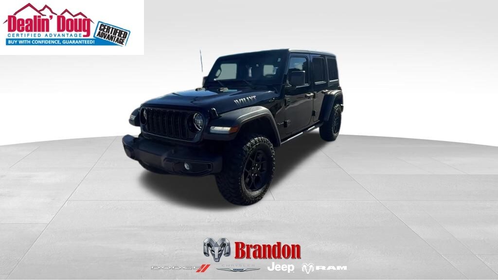 Certified. Black Clearcoat 2024 Jeep Wrangler Willys 4WD 8-Speed Automatic 3.6L V6 24V VVT 3.6L V6 24V VVT, 4WD, 2-Door Passive Entry, Front Door Locks, 240 Amp Alternator, 4-Wheel Drive Swing Gate Decal, 4.10 Rear Axle Ratio, 7 & 4 Pin Wiring Harness, 97 MPH Vehicle Max Speed Calibration, Advanced Brake Assist, Air Conditioning w/Auto Temperature Control, Air Filtering, Auto High Beam Headlamp Control, Automatic Headlamps, Auxiliary Switches, Black Grille, Blind Spot & Cross Path Detection, Class II Receiver Hitch, Cluster 7.0" TFT Color Display, Convenience Group, Conventional Differential Front Axle, Corning Gorilla Glass, Dana M210 Wide HD Tube Front Axle, Dana M220 Wide Rear Axle, Daytime Running Lamps LED Accents, Deep Tint Sunscreen Windows, E-Locker Rear Axle, Emergency/Assistance Call, Enhanced Adaptive Cruise Control, Front 1-Touch Down Power Windows, Front LED Fog Lamps, Full Speed Forward Collision Warning Plus, Heated Front Seats, Heated Steering Wheel, Injection Molded Black Rear Bumper, LED Premium Reflector Headlamps, LED Taillamps, Mold In Color Bumper w/Gloss Black, Molded in Color Rubicon Highline Flare, MOPAR All-Weather Floor Mats, Off-Road Plus Mode, ParkSense Rear Park Assist System, Power Heated Mirrors, Premium Wrapped Steering Wheel, Quick Order Package 24W Willys, Remote Keyless Entry, Remote Start System, Safety Group, Security Alarm, Speed Sensitive Power Locks, Sun Visors w/Illuminated Vanity Mirrors, Universal Garage Door Opener, Wheels: 17" x 7.5" Painted Black, Willy's Suspension, Willys, Willys Hood Decal.