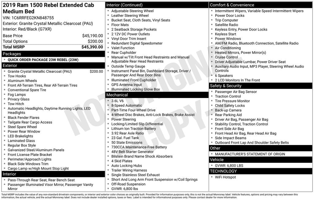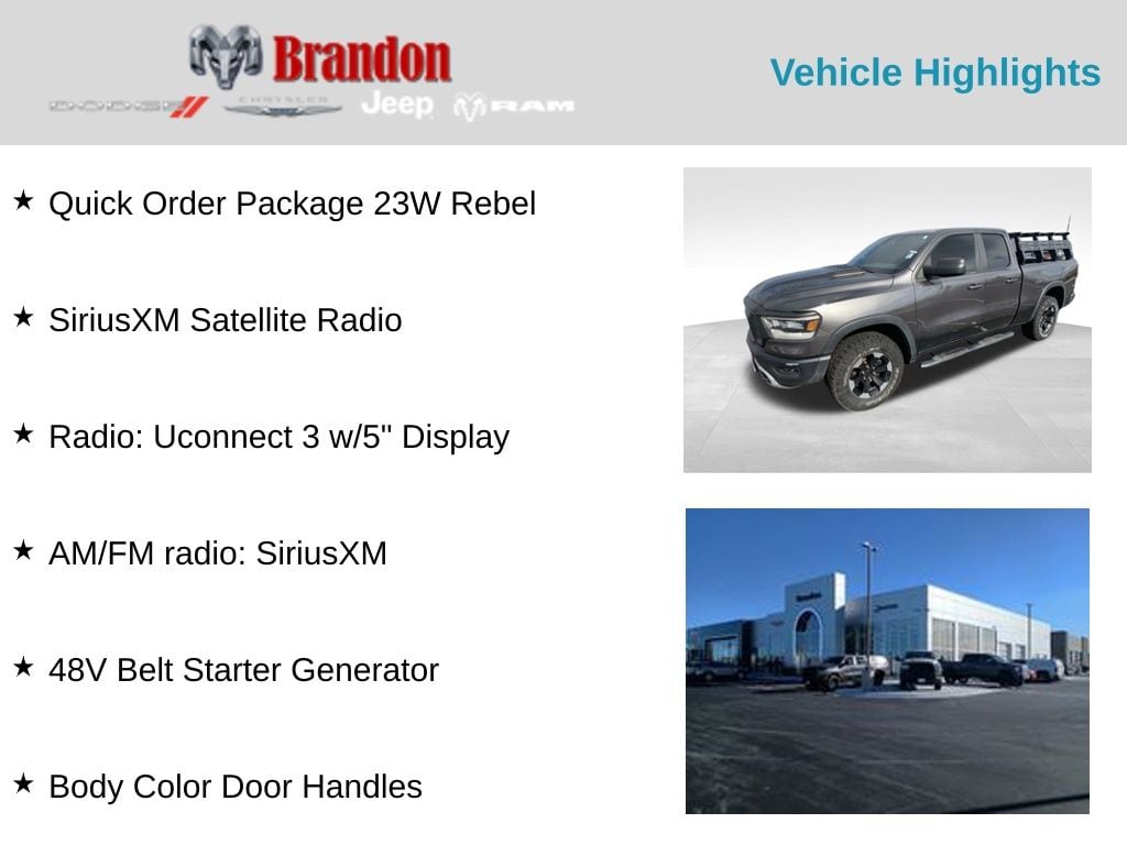 Certified. Granite Crystal Metallic Clearcoat 2019 Ram 1500 Rebel 4WD 8-Speed Automatic 3.6L V6 24V VVT 48V Belt Starter Generator, AM/FM radio: SiriusXM, Body Color Door Handles, Quick Order Package 23W Rebel, Radio: Uconnect 3 w/5" Display, SiriusXM Satellite Radio.
