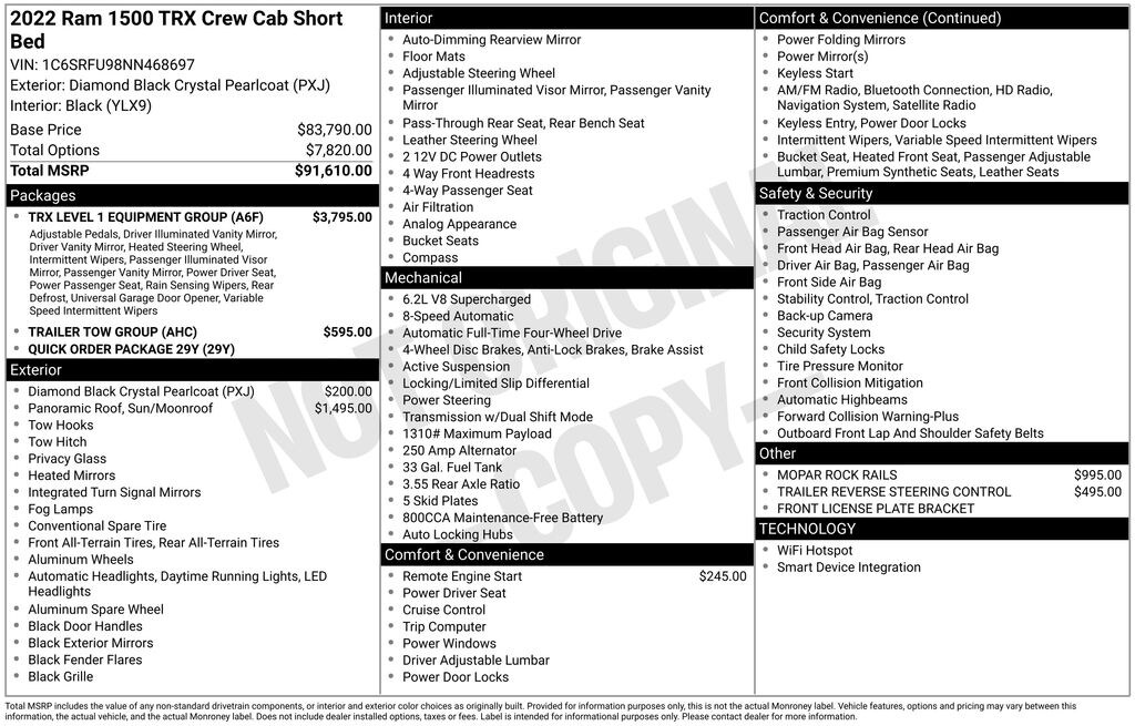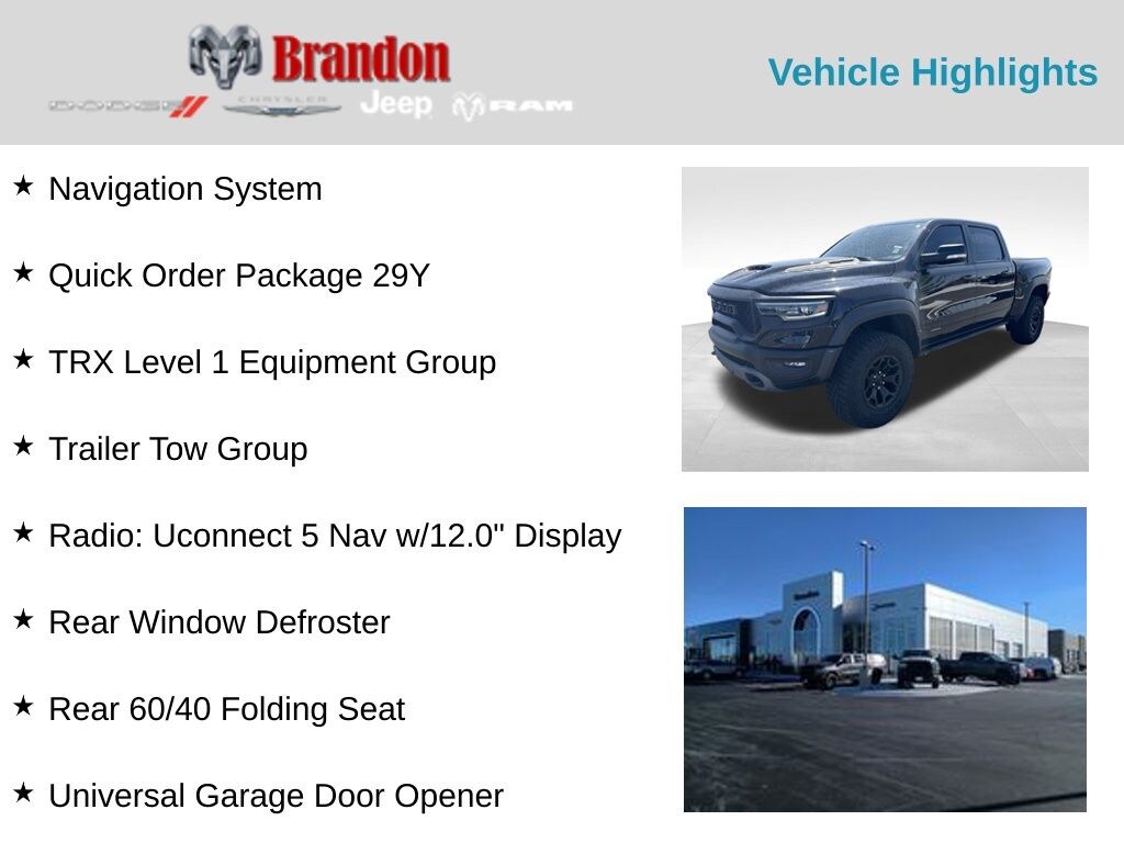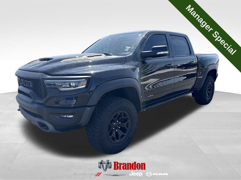 Certified. Diamond Black Crystal Pearlcoat 2022 Ram 1500 TRX 4WD 8-Speed Automatic 6.2L Supercharged HEMI V8 SRT #2 Seat Foam Cushion, 4 Way Front Headrests, Body Color Door Handles, Bucket Seats, Center Console Parts Module, Driver/Passenger Wrapped Assist Handles, Front Door Accent Lighting, Front Seat Back Map Pockets, Full Length Premium Upgraded Floor Console, Heated Front Seats, Heated Steering Wheel, IP LED Ambient Light Pipe, Leather Trimmed Bucket Seats, Luxury Front Door Trim Panel, MOPAR Bright Pedal Kit, Navigation System, Pick-Up Box Lighting, Power 4-Way Driver Lumbar Adjust, Power 4-Way Passenger Lumbar Adjust, Power 8-Way Driver & Passenger Seats, Power Adjustable Pedals, Premium Wrapped IP Bezel, Quick Order Package 29Y, Radio: Uconnect 5 Nav w/12.0" Display, Rain Sensitive Windshield Wipers, Rear 60/40 Folding Seat, Rear Door Accent Lighting, Rear Underseat Compartment Storage, Rear Window Defroster, Sun Visors w/Illuminated Vanity Mirrors, Trailer Brake Control, Trailer Light Check, Trailer Tire Pressure Monitoring System, Trailer Tow Group, TRX Level 1 Equipment Group, Universal Garage Door Opener.