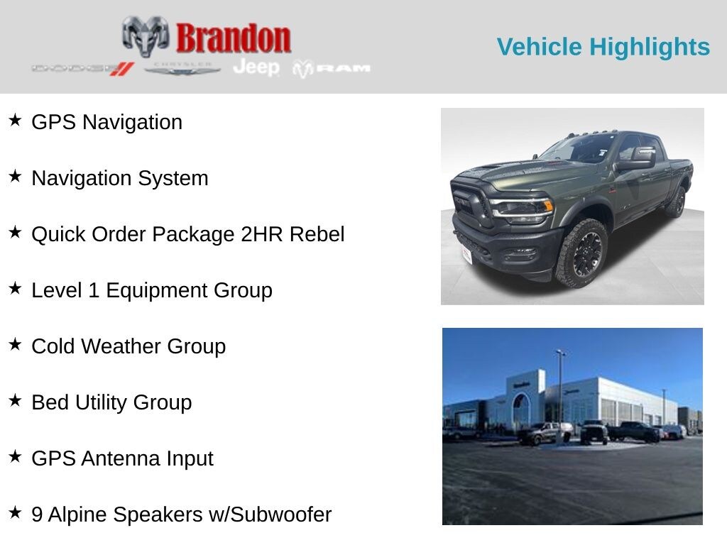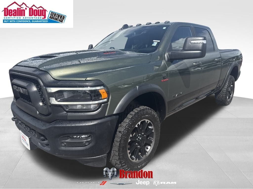 Certified. Olive Green Pearlcoat 2023 Ram 2500 Rebel 4WD 6-Speed Automatic Cummins 6.7L I6 Turbodiesel Cummins 6.7L I6 Turbodiesel, 4WD, 12" Touchscreen Display, 2 Way Rear Headrest Seat, 220 Amp Alternator, 4 Way Front Headrests, 40/20/40 Split Bench Seat, 4G LTE Wi-Fi Hot Spot, 4x4 Badge, 9 Alpine Speakers w/Subwoofer, ABS brakes, Alexa Built-In, Alloy wheels, Apple CarPlay, Auto Adjust In Reverse Exterior Mirrors, Auto Dim Exterior Mirror, Auto High Beam Headlamp Control, Auto Power-Folding Mirrors, Auto-Dimming Exterior Passenger Mirror, Bed Utility Group, Black Exterior Mirrors, Black Wheel Center Hub, Body Color Door Handles, Cloth Power Bench Seat w/Emboss Tread Pattern (B9), Cold Weather Group, Compass, Connected Travel & Traffic Services, Connectivity - US/Canada, Conventional Differential Front Axle, Disassociated Touchscreen Display, Electric Shift-On-The-Fly Transfer Case, Electronic Stability Control, Engine Block Heater, Exterior Mirrors Courtesy Lamps, Exterior Mirrors w/Heating Element, Exterior Mirrors w/Memory, Exterior Mirrors w/Supplemental Signals, Folding Flat Load Floor Storage, For Details, Visit DriveUconnect.com, For More Info, Call 800-643-2112, Forward & Reverse Utility Lights, Front Armrest w/Cupholders, Front Center Seat Cushion Storage, Front Door Accent Lighting, Front dual zone A/C, Global Telematics Box Module (TBM), Google Android Auto, GPS Antenna Input, GPS Navigation, HD Radio, Heated door mirrors, Heated Front Seats, Heated front seats, Heated Steering Wheel, High Back Seats, Illuminated entry, Integrated Voice Command w/Bluetooth, LED Bed Lighting, LED Dome Lamp w/On/Off Switch, LED Interior Lighting, Level 1 Equipment Group, Limited Slip Rear Differential w/Electronic Lock, Low tire pressure warning, Manual Adjust 4-Way Front Passenger Seat, Mirror Running Lights, MOPAR Deployable Bed Step, MOPAR Spray In Bedliner, MOPAR Winter Front Grille Cover, Navigation System, Off-Road Information Pages, Overhead LED Lamps, Painted Semi-Texture Film Instrument Panel Bezels, ParkView Rear Back-Up Camera, Power 2-Way Driver Lumbar Adjust, Power Adjust 8-Way Driver Seat, Power Adjust Mirrors, Power Adjustable Convex Aux Mirrors, Power Adjustable Pedals w/Memory, Power Heated Fold Telescopic Mirrors w/Memory, Power Telescoping Mirrors, Premium Overhead Console, Quick Order Package 2HR Rebel, Radio: Uconnect 5 Nav w/12.0" Display, Rain Sensitive Windshield Wipers, Rear 60/40 Folding Seat, Rear Door Accent Lighting, Rear Power Sliding Window, Rear Window Defroster, Remote keyless entry, Remote Proximity Keyless Entry, Security Alarm, Selectable Tire Fill Alert, SiriusXM Radio Service, SiriusXM w/360L, Storage Tray, Traction control, Trailer Tow Pages, Wheels: 18" x 8.0" Black Diamond Cut Aluminum.
