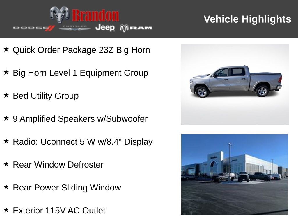 Certified. Billet Silver Metallic Clearcoat 2025 Ram 1500 Big Horn/Lone Star 4WD 8-Speed Automatic 3.6L V6 24V VVT 1500 Big Horn/Lone Star, 3.6L V6 24V VVT, 4WD, 115V Auxiliary Power Outlet, 2nd Row In Floor Storage Bins, 400W Inverter, 9 Amplified Speakers w/Subwoofer, Auto Power-Folding Mirrors, Auto-Dimming Exterior Driver Mirror, Auto-Dimming Rear-View Mirror, Bed Utility Group, Big Horn Badge, Big Horn Level 1 Equipment Group, Black Exterior Mirrors, Black Premium Power Mirrors, Convex Wide-Angle Exterior Mirror Insert, Exterior 115V AC Outlet, Exterior Mirrors Courtesy Lamps, Exterior Mirrors w/Heating Element, Exterior Mirrors w/Supplemental Signals, Glove Box Lamp, Heated Front Seats, Heated Steering Wheel, Leather Wrapped Steering Wheel, MOPAR 4 Adjustable Cargo Tie-Down Hooks, MOPAR Spray In Bedliner, Pick-Up Box Lighting, Power 2-Way Driver Lumbar Adjust, Power Adjust 8-Way Driver Seat, Power Adjustable Pedals, Quick Order Package 23Z Big Horn, Radio: Uconnect 5 W w/8.4" Display, Rear Power Sliding Window, Rear Window Defroster, Steering Wheel Mounted Audio Controls, Sun Visors w/Illuminated Vanity Mirrors, Universal Garage Door Opener.