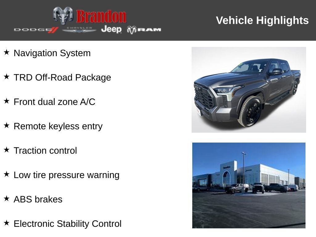 Certified. Granite 2024 Toyota Tundra Limited 4WD 10-Speed Automatic 3.4L V6 4WD, Black w/Leather Seat Trim, ABS brakes, Active Cruise Control, Alloy wheels, Electronic Stability Control, Front & Rear Mud Guards, Front dual zone A/C, Heated door mirrors, Heated front seats, Illuminated entry, Low tire pressure warning, Multi-Terrain Back Monitor, Navigation System, Remote keyless entry, Traction control, TRD Off-Road Package, Wheels: 20" Black Alloy.