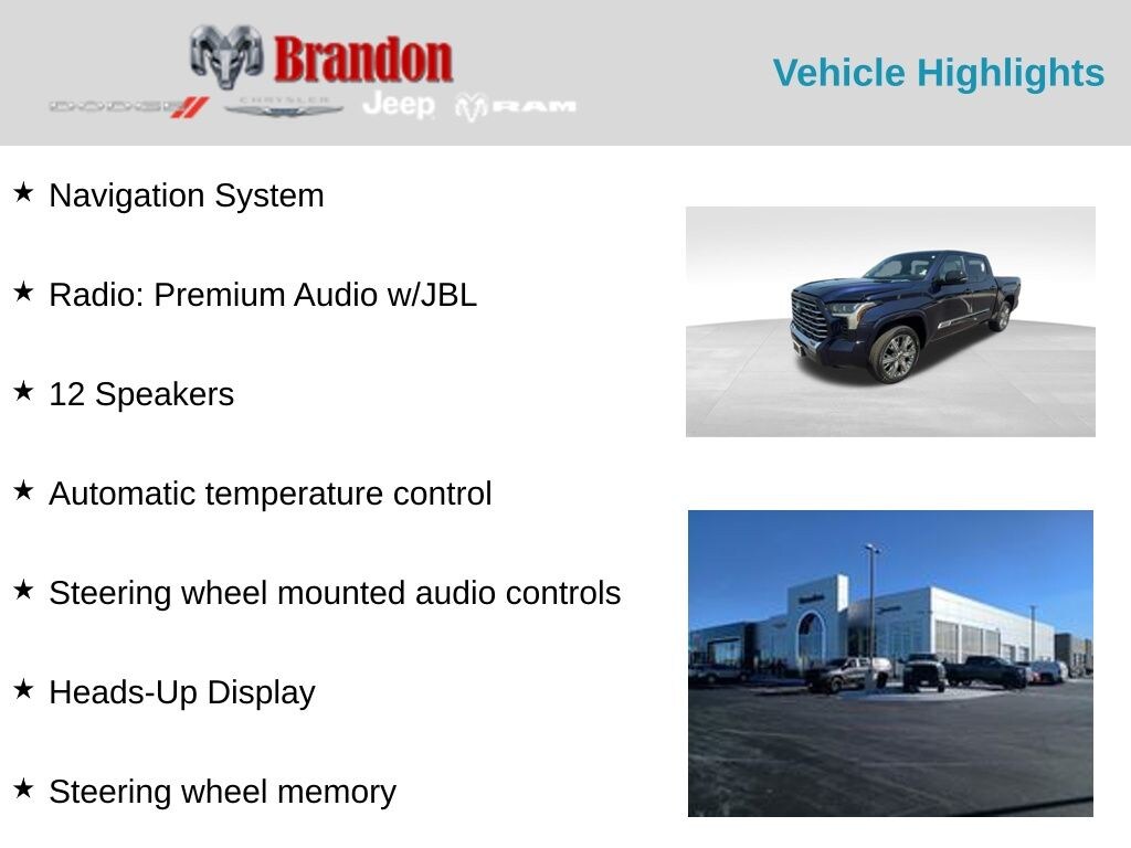 Certified. Blue 2024 Toyota Tundra Hybrid Capstone 4WD 10-Speed Automatic 3.4L V6 3.4L V6, 12 Speakers, Automatic temperature control, Heads-Up Display, Navigation System, Radio: Premium Audio w/JBL, Steering wheel memory, Steering wheel mounted audio controls.